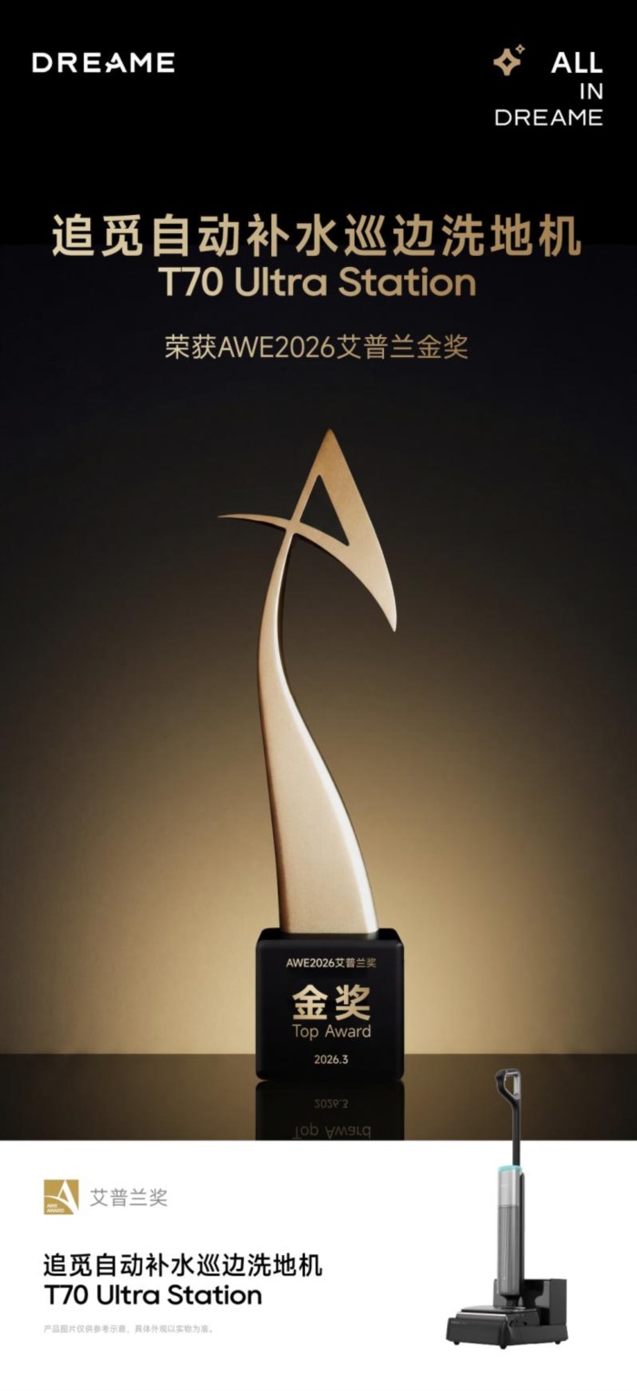 与此同时,追觅还将前机械臂升级至灵捕广域机械臂3.0,在延续0贴边、0水渍体验的基础上,将抬升高度提升142%,能够轻松吸除宠物粮、果壳等大颗粒脏污。配合全新升级的灵羽超轻薄2.0系统,在保持9.85cm至薄机身的同时,整机吸力提升至27000Pa,并支持180°恒动平躺,能够轻松深入床底、沙发底等低矮区域,彻底清除长期积灰。在本届AWE 2026展会期间,追觅T70 Ultra Station获得了家电界最高荣誉--艾普兰奖金奖,也是本届展会唯一一个获得艾普兰金奖的洗地机品牌,以创新实力再次展现了品牌在洗地机领域的领先实力。