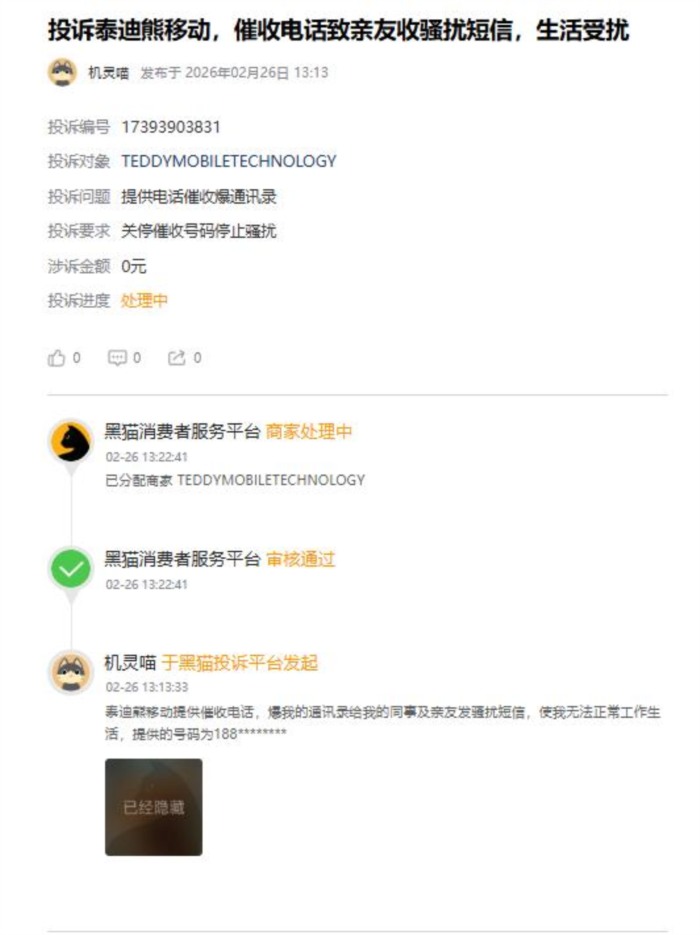 有用户投诉称:“最近十天左右频繁接到涉骗信息,最晚是晚上十二点多,严重影响我的生活”还有用户投诉称:“泰迪熊移动提供催收电话,爆我的通讯录给我的同事及亲友发骚扰短信,使我无法正常工作生活”,另一位用户详细描述维权经历:“我近期被该公司的电话持续骚扰。每天都会接到来自该方的营销电话,不分时段,挂断后仍反复拨打,严重影响了我的工作和休息。 ”该用户要求泰迪熊移动“ 1. 立即停止对我手机号码的一切外呼骚扰;2. 永久删除我在贵司系统中的所有个人信息;3. 请贵司规范营销行为,杜绝此类侵权事件再次发生。 若不处理,我将继续向工信部、12315及运营商总部进行升级投。”