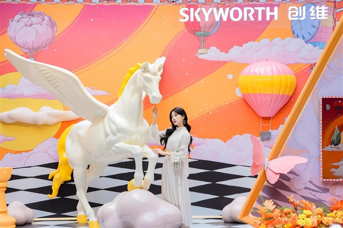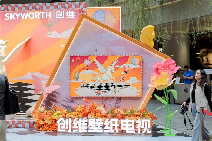 现场设置的多个打卡点成为人流聚集地,观众或立于飞马雕塑旁,定格“马到成功”的瞬间,或漫步在“棋盘”上,成为壁纸的生动元素,或与墙面上的创维壁纸电视A7H Pro合影,电视屏幕中播放的正是同款动态壁纸,与现实展陈虚实相生,引人入胜。