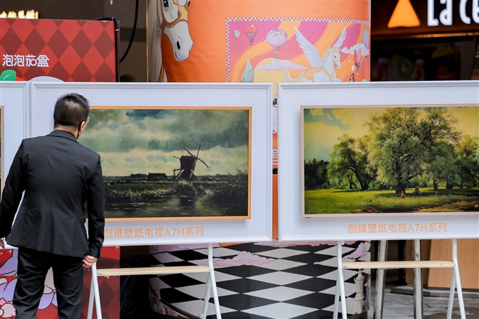 本次展览的核心载体——创维壁纸电视A7H Pro同样成为人们关注的焦点。在展陈中,创维壁纸电视A7H Pro凭借无缝贴墙的极致超薄机身、全直角切边的画框式设计,完美“隐身”在背景板中,在壁纸模式下,电视与墙面融为一体,化身成一件动态的数字艺术画作。