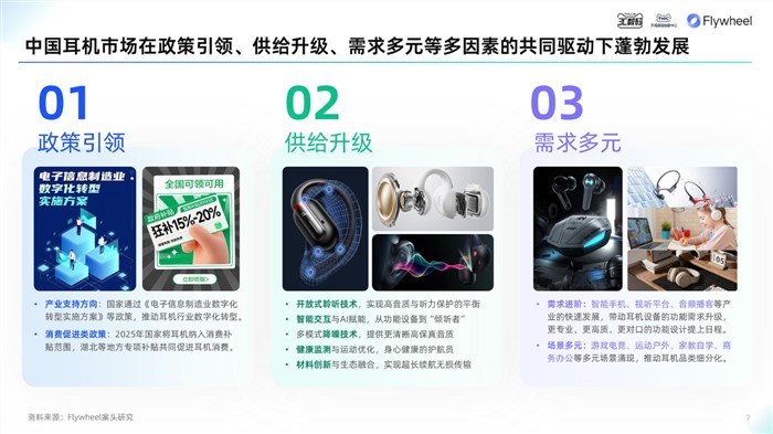 驱动这一趋势的,不仅是无线技术、主动降噪等核心技术的迭代普及,更深层次的是消费者需求的根本性转变:耳机已从简单的音频播放工具,演进为融合个人娱乐、高效办公、健康管理及智能交互于一体的个人智能穿戴终端,消费者开始为精准匹配不同生活场景的细分体验而付费,“一人多机”正成为新常态,也为品牌在智能化、健康化、场景细分、生态互联等赛道的创新提供了广阔的空间。基于此,天猫3C数码、TMIC和Flywheel飞未共同发布《2025天猫耳机品类年度白皮书》,旨在深入剖析耳机品类的趋势赛道与场景机遇,为市场参与者提供前瞻性的决策参考。