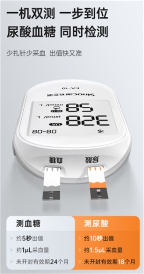然而,提及尿酸监测,很多人会担心去医院不方便,那么选择一款品质可靠的尿酸测试仪就成为了一个不错的选择。在众多尿酸测试仪中,三诺生物推出的EA-19型血糖尿酸测试仪备受推崇。它仅需一滴血便能同时测量血糖和尿酸两项指标,且10秒内即可出结果,适用于全家人使用。其精准度和便捷性在同类产品中名列前茅。