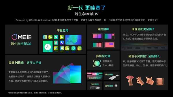在软件交互系统上,A6 MAX搭载全新大屏软件操作系统ME柚OS,支持自由拼屏、多种操控方式、海量应用等多种功能,满足了当下消费者教育、娱乐、办公等多种场景下的使用需求。拥有多任务管理、多窗口拼接能力,多窗口的视频源支持App应用、手机、电脑的投屏,排布方式也有1:1拼接、大屏拼小屏、横屏拼竖屏、画中画等多种选择,在能实现多窗口播放的前提下,努力保证多任务的流畅性。A6 MAX还支持AI语音、AI摄像头、无线投屏、AI音箱、无线传输支持Wi-Fi 6+、蓝牙等,让AI智慧科技充分融入到我们的生活中来,为我们的大屏娱乐生活丰富多彩。