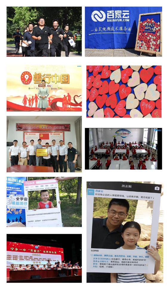 百家云一直积极履行社会责任,关注教育公益。今年年初,百家云为中国社会福利基金会授渔计划捐助了100万元善款,用以资助农村困境学生和援建“双师课堂”;今年9月,百家云举行了公益健行活动,让超过200名参与者通过参与运动的形式完成公益助力,为山区儿童捐出了由百家云提供的50万元善款。此外中华慈善日这天,由百家云免费提供技术和系统支持的“善行课堂”,同步为偏远山区孩子们带来了别开生面的《开学第一课》。不仅如此,今年秋天百家云创始人兼CEO李钢江还向母校宁乡一中捐资,设立了“百家云奖学金”。