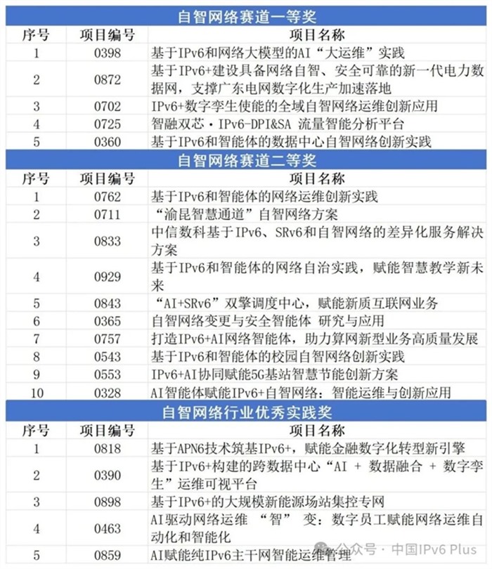 第三届“IPv6技术应用创新大赛”AI WAN赛道一、二等奖获奖项目名单