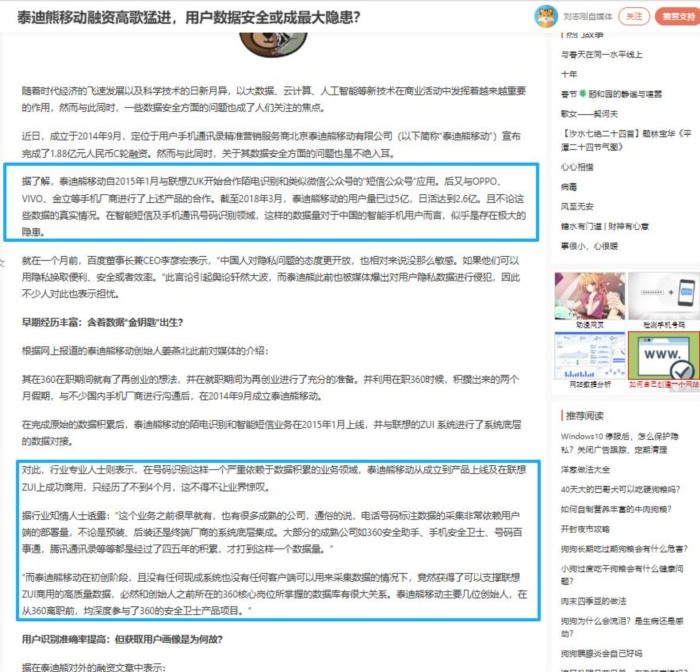在百度搜索泰迪熊移动(泰迪未来科技)这家的历史媒体报道,发现其自成立之日便伴随“数据安全”问题的质疑。有篇新闻报道,泰迪熊移动于2014年9月创立,仅用4个月便完成号码数据积累与产品研发,2015年1月产品上线联想ZUI。这一速度远超行业常规——同类数据积累通常需要大厂四五年时间。由于公司在无终端、无客户端采集数据的情况下快速突破,其创始团队的背景引发行业关注。