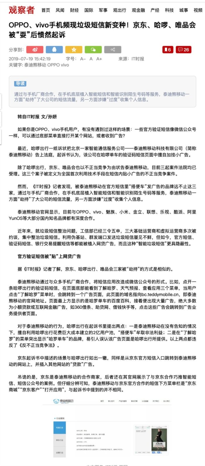 2019-2020年,泰迪熊移动又因智能短信被京东、哈啰、唯品会、腾讯以不正当竞争为由告上法庭,称其在企业的验证码短信内贴小广告,这个案子被定义为全国首次利用技术手段在短信内贴小广告的不正当竞争案件。