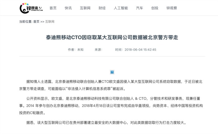 2018年,又传出“泰迪熊移动联合创始人兼CTO欧文盛因侵入某大型互联网公司系统窃取数据,于近日被北京警方带走调查,可能面临以“非法侵入计算机信息系统罪”被起诉。 ”的新闻,泰迪熊移动并未就此新闻进行澄清与声明。