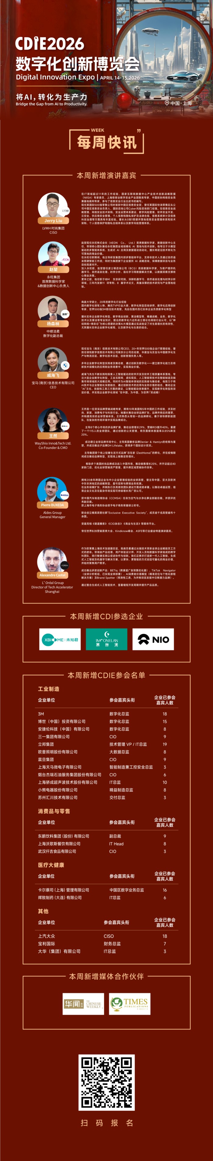 截至目前,CDIE2026已成功邀约数百位全球顶尖企业的数字化领袖重磅加盟。从国际奢品巨头到国民领军品牌,从高端制造龙头到医药健康标杆,来自全行业的CEO、CIO、CMO、CSO等核心决策层将齐聚上海,带来最前沿的行业洞察与数字化转型实战经验。
