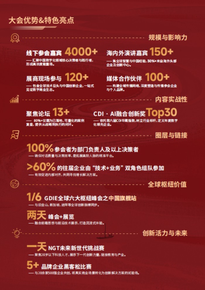 全新首创内容:2026CDIE首次开创【NGT未来新世纪挑战赛】以及【企业开放式创新专场】,同时将根据细分行业和主题设置对应展区,涵盖全行业全领域科技厂商,并创新设立【前途无忧展区】,鼓励品牌方积极展示企业 数字化创新实践,吸引高质量优秀人才。