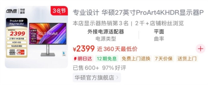 华硕ProArt创梦27专业显示器降至2399元:专业校色不再是付费门槛