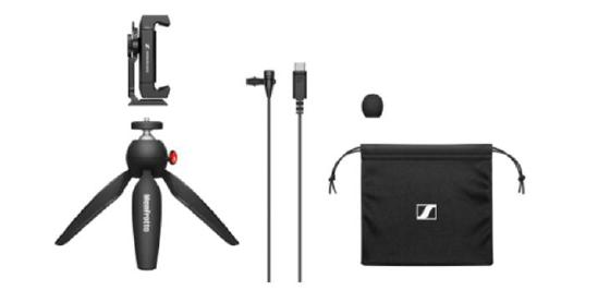 XS Lav系列领夹话筒标配一个话筒夹、可拆卸的泡沫挡风罩和一个拉绳收纳袋。XS Lav领夹话筒 USB-C拍摄套装还配备了森海塞尔智能手机夹和Manfrotto PIXI迷你三脚架。