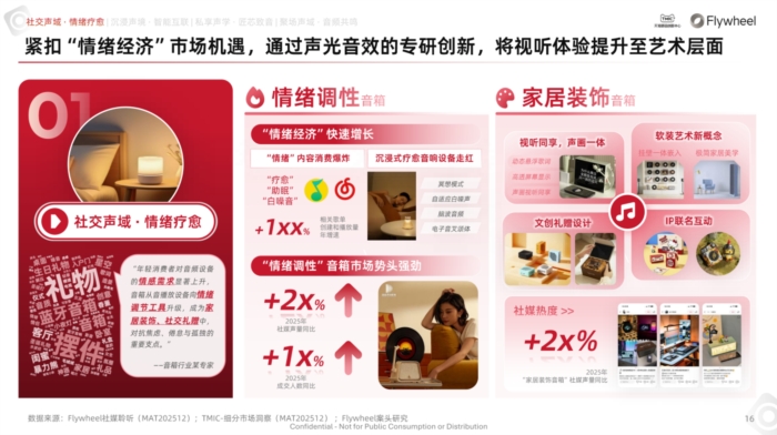 随着情绪经济的持续升温,社交声域中的情绪疗愈需求正推动音箱品类向兼具情感价值与美学表达的复合型产品演进。这一趋势清晰地划分为两大核心方向:一类是情绪调性音箱,聚焦用户内在情绪的安抚与调节,通过疗愈、助眠、白噪音等场景化功能,配合沉浸式声场与智能交互,满足年轻人对心理舒缓与睡眠改善的迫切需求;