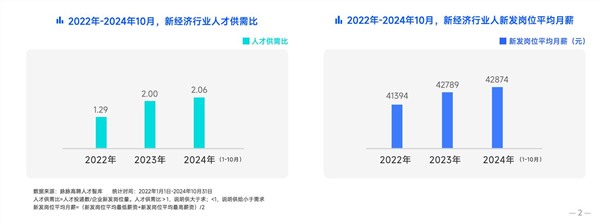 《报告》显示,2022年到2024年10月,新经济行业人才供需比逐年上升。2022年全年的人才供需比为1.29,2023年上升到2.00,相当于2个人才争夺1个岗位。2024年1-10月,人才供需⽐再度攀升至2.06,人才求职竞争进一步加剧。 虽然求职难度较大,但岗位薪资保持了上升态势。2022年全年新发岗位的平均月薪为41394元,2023年上升为42789元,2024年1-10月,平均月薪再度微涨至42874元。